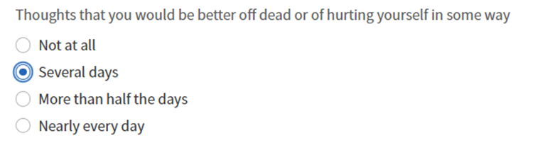 result of PHQ-9 question #9 “Thoughts that you would be better off dead