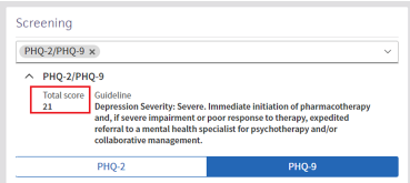 has a PHQ-9 of 15+ (Either imported from our check in vendor or manually entered in the