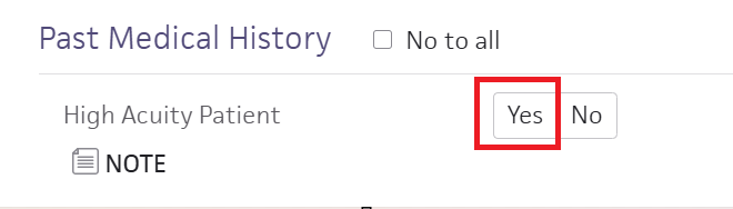 - Selecting “Yes” for “High Acuity Patient” in Past Medical History