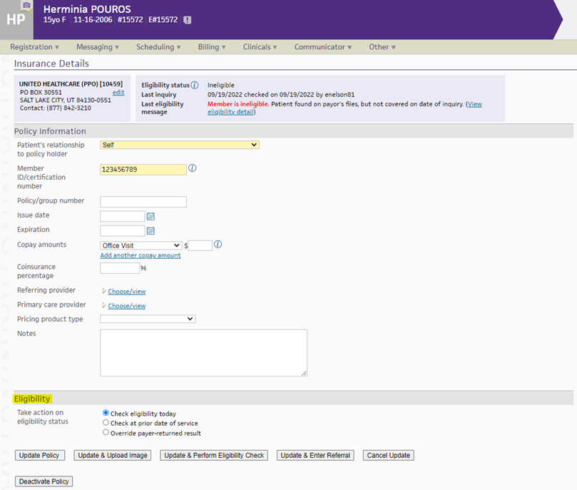 On the Patient Actions Bar, click Registration, and then click Check Eligibility. If the patient has only one policy registered in athenaNet, the Eligibility Detail page appears