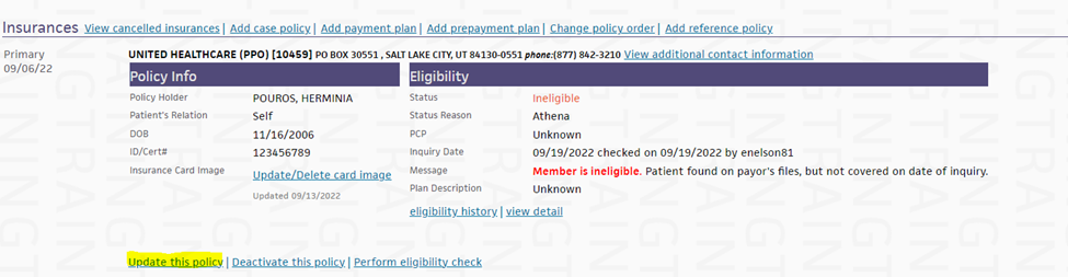3. The Eligibility Detail page appears. If the patient has more than one policy registered in athenaNet, you can: